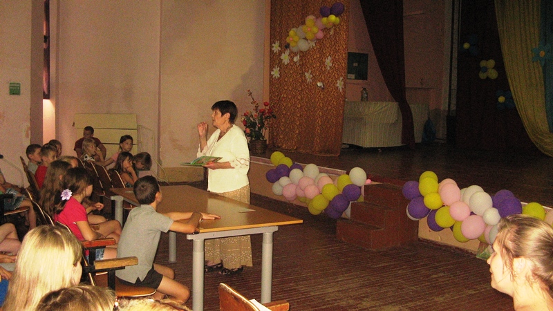 Така подія неабияк сколихнула увесь табір, бо ж не кожного дня діти зустрічаються із «живим» письменником, отож три загони зібрались у святково прикрашеній актовій залі. Розпочали захід бібліотекарі, які разом із дітьми гучно скандували гасла про книгу і читання: «Літо, книга, діти – будемо радіти», «Будемо усі читати і розумними зростати!» та інші, а далі - цікаве віршування, незвичайні загадки та головоломки, словом - усе те, що допомагає налаштувати публіку на сприйняття необхідної інформації.
